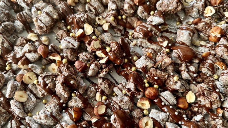 Traditional muddy buddies are made by coating Chex cereal in a combination of melted peanut butter, butter, and chocolate. The mixture is then coated with a thick layer of powdered sugar, and sometimes tossed with holiday candy like M&M's, for a sweet snack you can eat piece by piece (good luck stopping at just a few). For this version, chocolate Chex are coated with Nutella and dark chocolate, then lightly coated with powdered sugar for glorious clusters of crisp, nutty, chocolaty goodness — with a hint of salt in the mixture for a balanced flavor profile. Chopped hazelnuts and metallic dragees are added for a sophisticated holiday touch, as well as mini chocolate-covered pretzels or an irresistible finish.