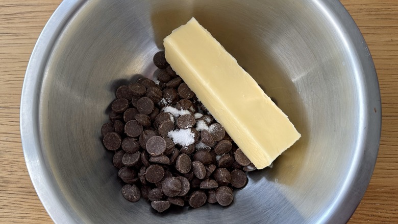 - Place butter, 1 cup chocolate chips, and salt into a small bowl.