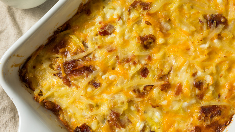 You can use this hack for breakfast or dinner casseroles. If you're making one for the early morning, add the cubed baked biscuits, eggs, veggies, and cheese to an oven-safe baking dish and cook until set. It's a great recipe to use for potlucks since you can make it in advance and bring it back up to temperature in the oven when you need it. You can also make a rendition of a classic sausage and gravy plate by piling on your sausage gravy and cheese with the cubed biscuit pieces in the casserole dish.