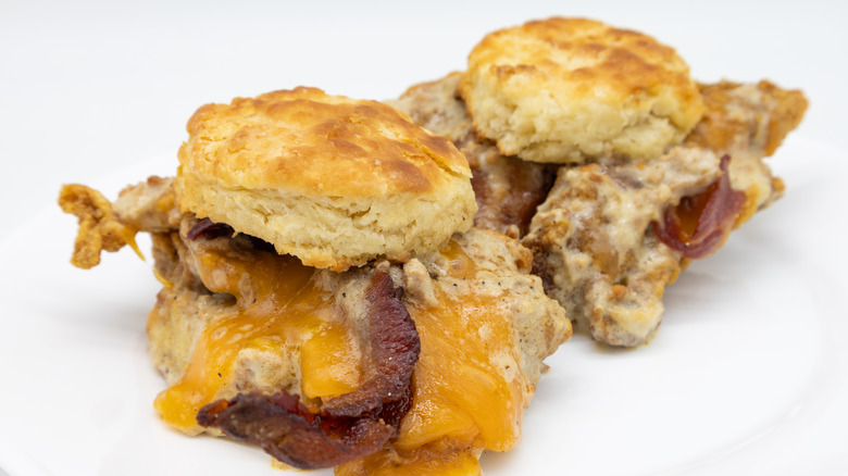 Biscuits, including stale ones, are an ideal fit for this recipe because the dryness of the biscuit will act like a sponge for all of the flavors. You can also opt to go with a savory bread pudding, such as one with sausage and cheese, or a sweet one with maple syrup, nuts, and vanilla notes. Cube your biscuits into small pieces before layering them in an oven-safe baking dish with your accompaniment. Before baking, pour the custard over the entire dish and bake it until it has set through. Bread pudding is a dish appealing to all palates, and it's a great way to use up all of the leftovers in your fridge and pantry — including the biscuits.