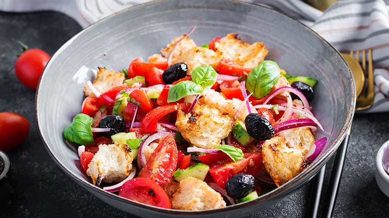 Panzanella salad is a bright, veggie-forward dish perfect for summer nights on the patio. It's an Italian salad containing stale bread, so it's an ideal vector for using up any forgotten-about loaves or biscuits in your kitchen. If your biscuits are too fresh for Panzanella, pop them into your oven to dry them out before you start slicing your produce and assembling your salad. In addition, you can elevate any Panzanella recipe by frying the bread in a pan with oil or butter until it turns golden brown and crispy all over. The biscuits pair well with almost any vegetables or fruit, but we love making this recipe with salty feta cheese, sweet peaches, sharp red onion, and bright tomatoes.