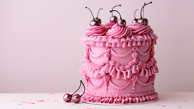 The current vintage cake trend usually features a small circle cake with a few layers, covered in a single color of buttercream, and then really decked out in layers and layers of beautifully draped piping. I've seen these cakes decorated with everything from dainty pearls to glitter-dipped cherries to fondant letters cut out and placed on the top for birthdays and celebrations. What I love about the aesthetically pleasing vintage cake resurgence is that it really showcases the baker's skill and abilities in a way that other pastries don't. You need to be a skilled baker to accomplish the different piping techniques and that is something I can appreciate — along with just how pretty these cakes are. Keep 'em coming into 2024, I say.