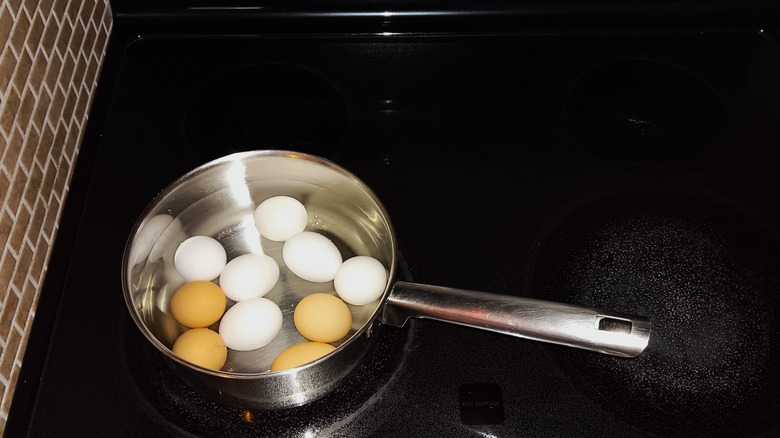 Place room temperature or cold eggs in a pot with enough room for them to roll around a little. As with cooking most foods in a pot or pan, you don't want to overcrowd the food. Fill the pot with fresh cool water so it just covers the eggs, about a half-inch to an inch. Cover the pot, and bring the water to a boil. Keep the pot covered and remove it from the heat. Begin your timer. The time ends when the eggs are plunged into an ice bath.