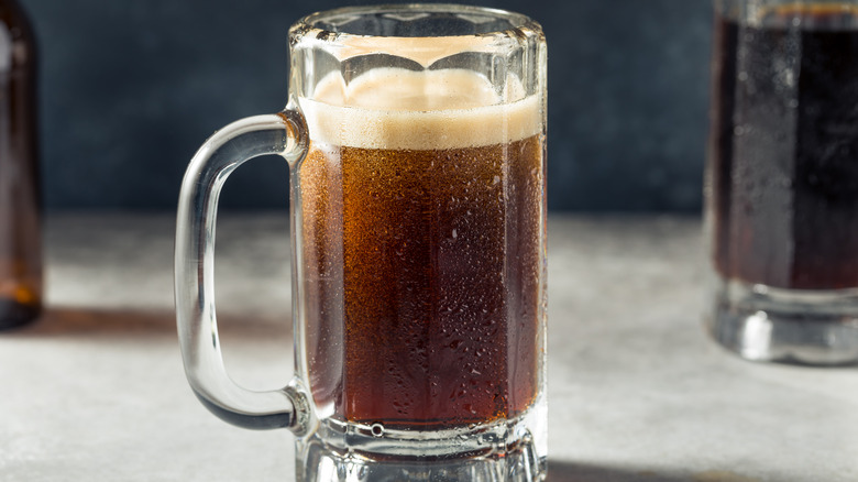 While each brand might have its own recipe and blend of ingredients, vanilla, wintergreen, ginger, licorice, anise, juniper berries, dandelion, cinnamon, and cane sugar help give root beer its unique flavor. Root beer's mesh of botanicals makes it an acquired taste that doesn't appeal to everyone. However, if you find you're in the root beer-loving camp, root beer and peanut butter might be the combination you never knew that you needed to try. Luckily, you don't need much to make a cocktail with root beer. It can be as easy as a can of root beer with a shot or two of your peanut butter whiskey. Gently mix them in your vessel of choice so you don't get rid of all the carbonation.