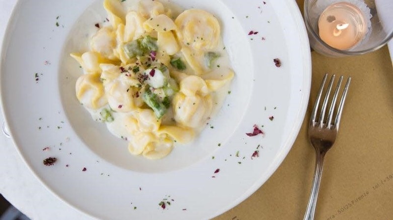 If you want to copy the world-renowned fiocchetti dish from Trattoria 4 Leoni, you'll want to stuff your pasta purses with a mixture of ricotta, Pecorino Romano, parmesan, and chopped pears — although you can also incorporate another creamy cheese, like mascarpone, if you'd prefer. The flavor combination is so popular now that you may even be able to find boxes of purse-shaped pasta with dehydrated pears and cheese already stuffed inside, which you can simply pour into boiling water and cook like any other noodle. To truly replicate the trattoria's dish, top your fiocchetti off with a creamy béchamel sauce, reminiscent of the taleggio cheese sauce the restaurant uses.