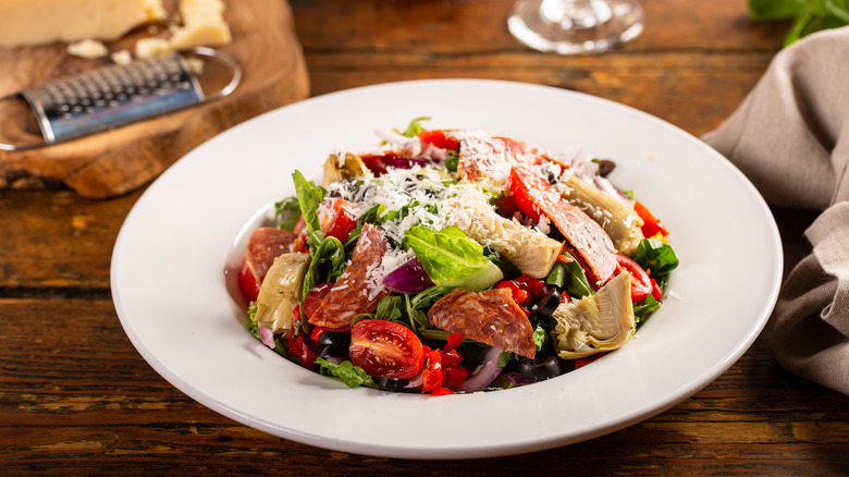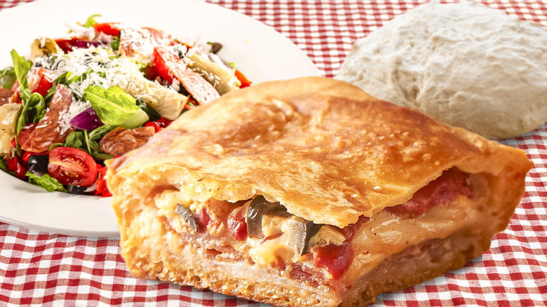 Antipasto, typically a platter of cheeses, cured meats, olives, and spreads, is an Italian-style appetizer that's reminiscent of a charcuterie board. These days, antipasto has been turned into a variety of other recipes like pasta salad and sandwiches. It's also the perfect blend of tastes and textures from ingredients like salami and kalamata olives in a refreshing and flavorful salad. If you have leftovers, turn that salad into a baked sandwich with the help of store-bought dough. It's a great way to use up the leftovers before they go soggy or lose their fresh flavors.