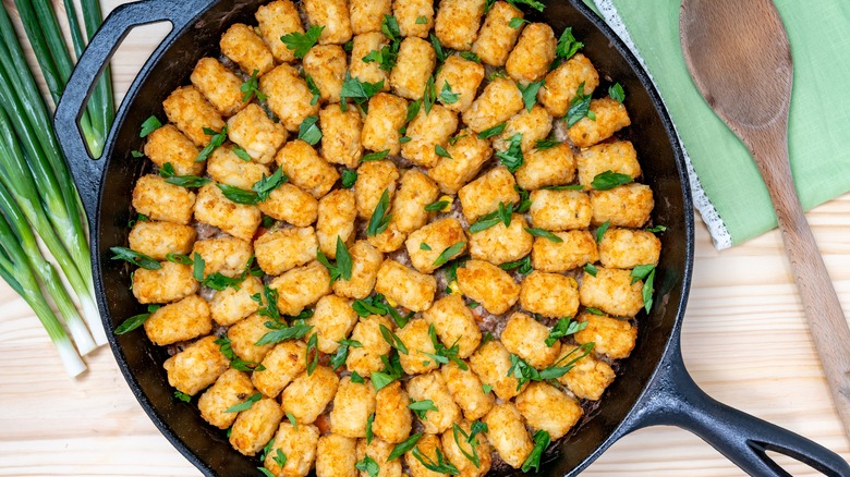 Preparing this dish couldn't be easier. Cook the bottom layer consisting of meat, spices, and veggies, then top it with a single layer of tater tots. You can even cook the tots from frozen, saving you more time in the kitchen. Once you remove the dish from the oven, you'll find the tater tots provide a dreamy contrasting crunch to the rest of the dish, which makes it more palate-pleasing. Kids love it, adults love it, and you may never go back to mashed potatoes after trying it.