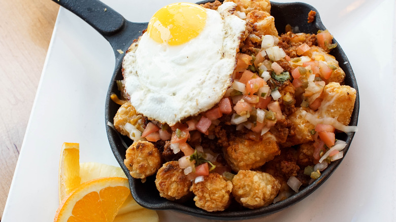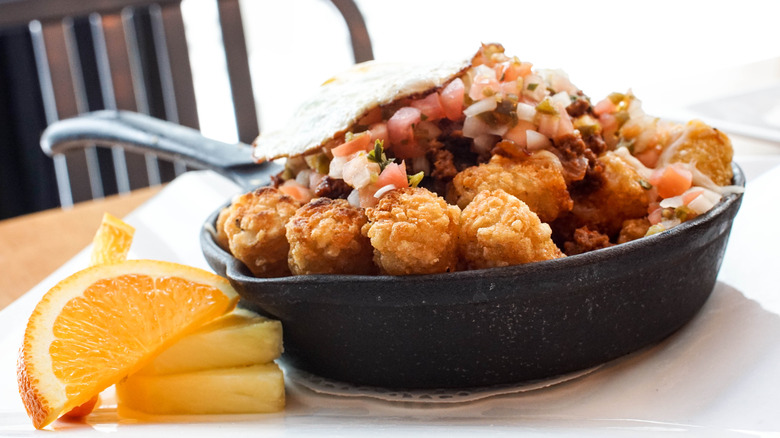 Tater tots are far more versatile than many people realize given the potato product's general association with school cafeterias. Although there's nothing wrong with enjoying a piping hot dish of tots with a sprinkle of salt and a side of ketchup, there are numerous additional ways to utilize this oft-frozen ingredient in your kitchen. The versatility of tater tots is a big reason why these little bundles of joy — with a soft potato interior encased by a crispy outer layer — earned the number-one spot in our ranking of fry types.