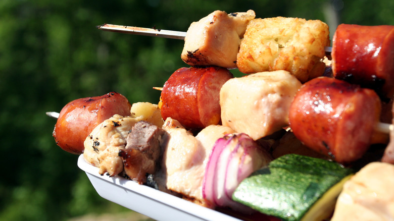 Gone are the days when you're forced to eat another tray of uninspiring pigs in a blanket at cocktail hour. Now, you can prevent everyone from getting their hands greasy by serving a memorable appetizer with tater tot kebabs. These sticks — which can be substituted with toothpicks to create smaller serving sizes — are easy to eat and pair with complementary foods.