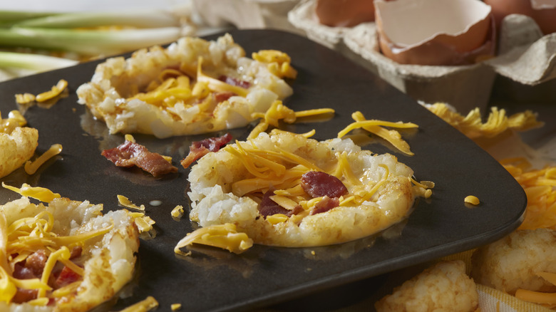 The shape of a tater tot isn't exactly conducive to stuffing with additional ingredients (unless you have a pair of plating tweezers handy). To make frozen taters tots more amenable to this method, you'll need to flatten them first — which can be done with a muffin tin.