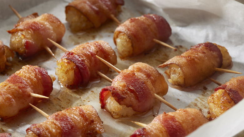 The best way to make any food better? Add bacon. On that note, bacon-wrapped tater tots are sure to be a hit at your next party — and are also a great way to use up leftover strips of bacon from breakfast. The trick is to slice the cured pork strips in half along the centerline before wrapping them around each tot and securing them with a toothpick. You can even add a piece of cheese alongside the bacon If you want more decadent tots.