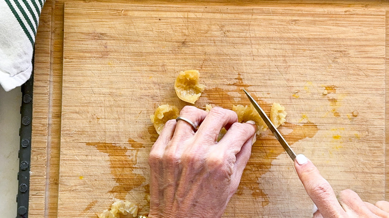 - Cut the preserved lemon into quarters then scoop out and discard the flesh. Chop into ¼-inch strips.