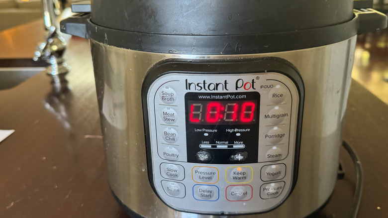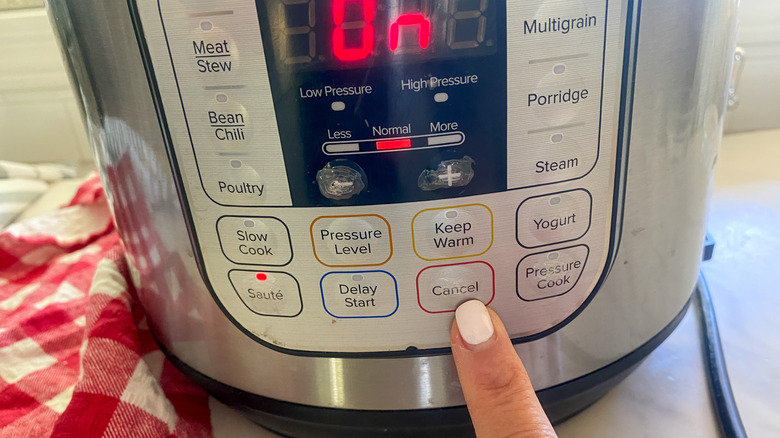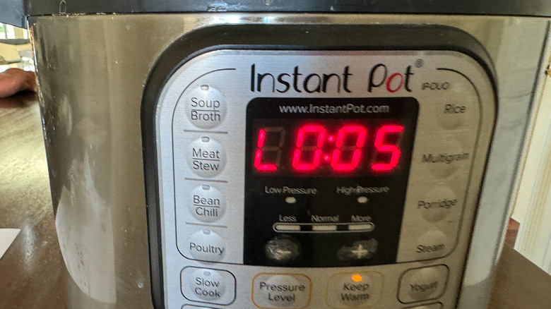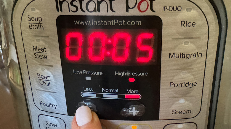 - Put the lid on the Instant Pot and select the sealing function. Select high pressure and set the time to 5 minutes.