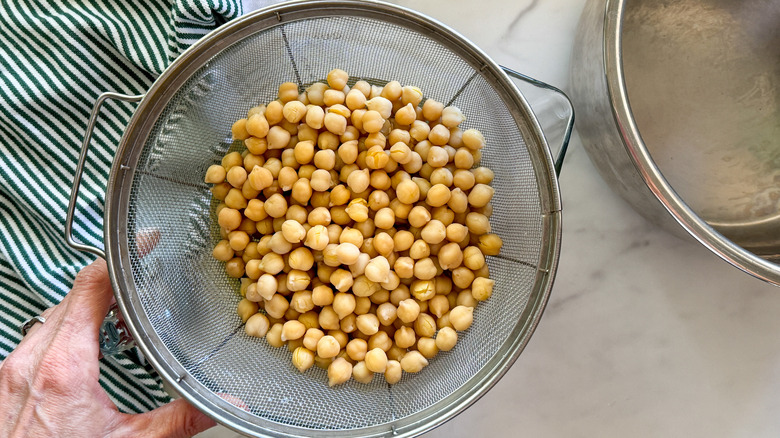 Pour the chickpeas into a colander positioned over a bowl to reserve the cooking water.