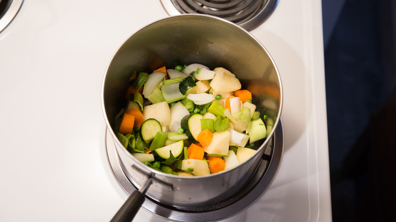 - Place the leek, onion, celery, carrots, potato, peas, and zucchini in the pot and saute them in the oil, stirring occasionally so they don't stick, for 5-6 minutes.