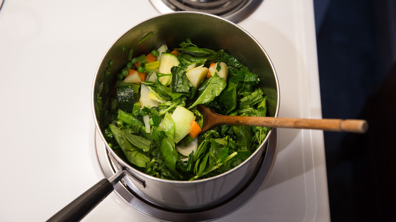 - Add the parsley, kale, turnip greens, and spinach and cook for 2-3 minutes until they begin to wilt. You may need to add them a little at a time depending on the size of your pot.
