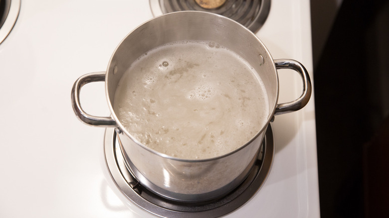 - Add salt and pepper and raise the heat to high to bring the water to a boil.