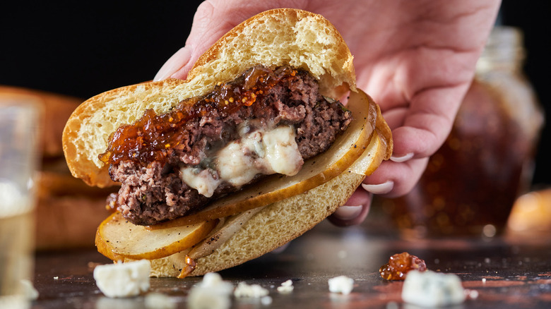 There's a reason that blue cheese is a little bit divisive — it has a very strong tangy taste. When it comes to eating a burger, you may not want that tanginess to be the main flavor. Luckily, McGlinn has a solution to that: fig jam. Fig jam is sweet but not too sweet, making it the perfect ingredient to balance out the blue cheese. The combination of the blue cheese and the fig jam, along with roasted pears, makes for a burger that has everything: savoriness, sweetness, and tartness. Plus, an extra perk of this recipe is that you can adjust each of those flavors to your exact liking. If you only want a hint of tanginess, then you can add less cheese, or you could heap on extra fig jam to further counteract it.