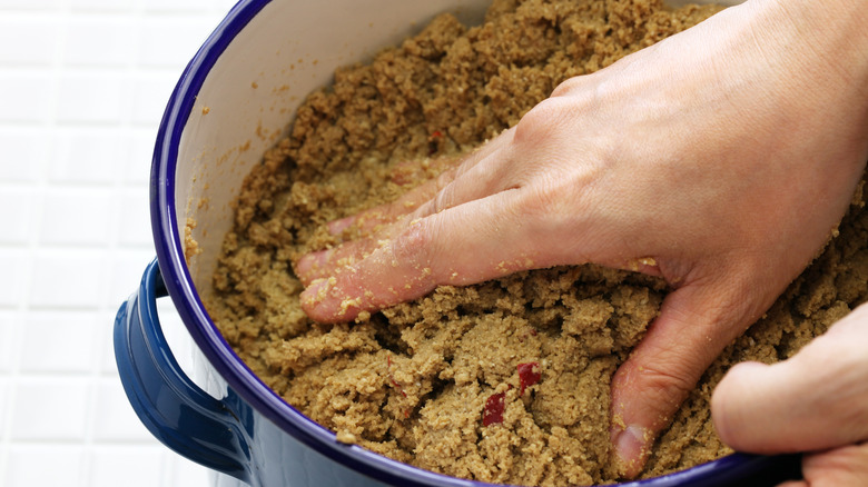 Once you've packed and patted down the bran bed in a fermenting vessel, cover it with a top and leave it slightly ajar. Then, place the vessel in a dark, cool place for a minimum of 10 days, stirring and repacking the bran bed once a day. If you want to speed up the fermentation process, you can stir in a tablespoon of beer or bury pieces of bread in the bran. A strange miso-like or funky odor and a tangy taste to the rice bran bed signal successful fermentation.