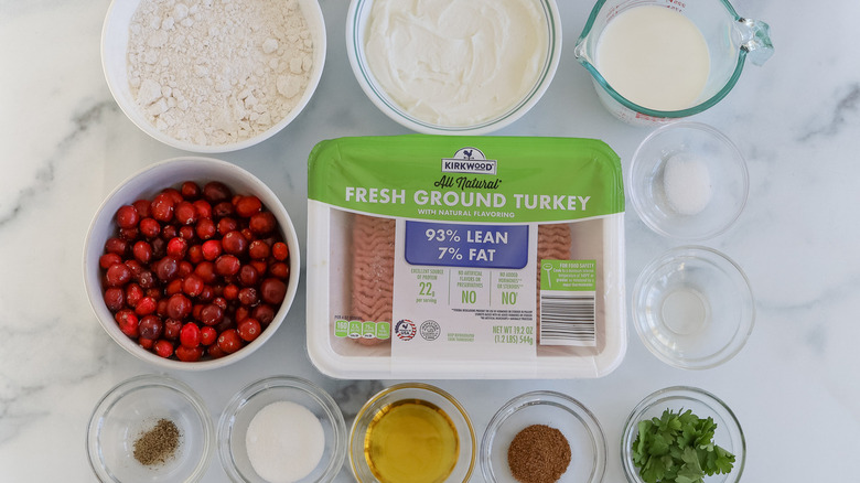 The flatbreads are made with flour, salt, sugar, olive oil, and milk. For the turkey topper, you'll need ground turkey, garam masala, and pepper, while the cranberry chutney calls for cranberries and vinegar (white or red wine). You will also need plain yogurt to form another layer underneath the turkey and chutney.