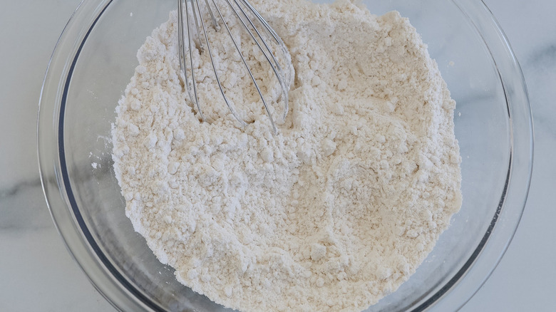 - In a large bowl, whisk together the flour, salt, and sugar.
