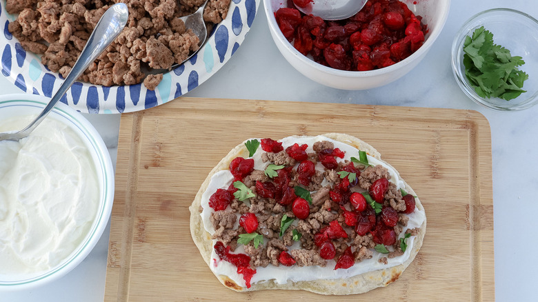 While you're preparing this recipe, you might as well go ahead and double or triple the flatbread portion, too. Use one batch for the ground turkey flatbread with cranberry chutney, but save the rest for ... well, all manner of things. Morone says of these flatbreads, "Once they are cooked, the sky is really the limit on anything you want to do with them."