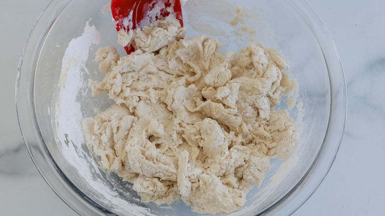 - Add the olive oil and the milk to the bowl and mix together until a shaggy dough forms.