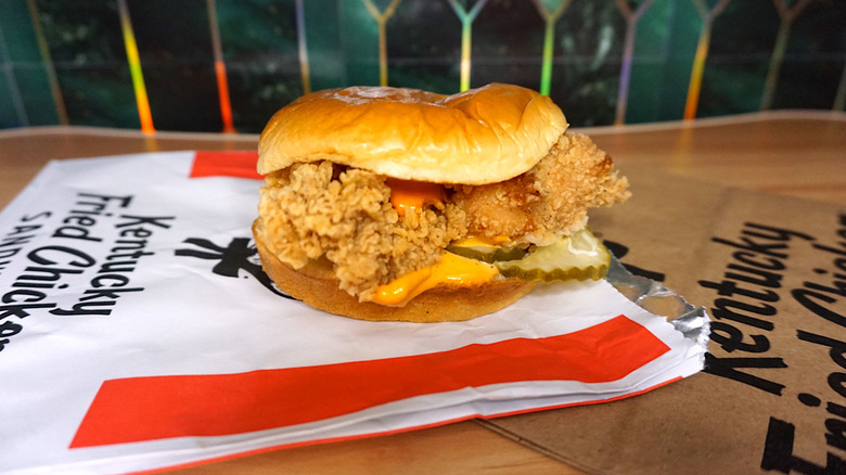 With what's probably some of the actual best chicken on this list, KFC also happened to have a high-heat spicy chicken sandwich, hence its position near the top. The KFC Spicy Chicken Sandwich, as it's named, had a spicy sauce on top that blew almost all of the other spicy sauces out of the water. It also featured some gigantic, thick pickle slices on top that were a bit too much for us, and this sandwich decided to teter the line between edible and, well, not.