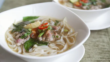 If you look closely, you'll notice that all the ingredients in a bowl of phở — including the broth, noodles, meat, condiments, and fresh herbs — contribute to these five essential tastes. But let's focus on just one of these five flavors for today: sweetness. In phở, sweetness comes from natural sugars in aromatics like caramelized onions and shallots. Additionally, the broth gets a touch of sweetness from simmering meaty bones and marrow in the pot, known in Vietnamese as "ngọt thịt" or "meaty sweetness."