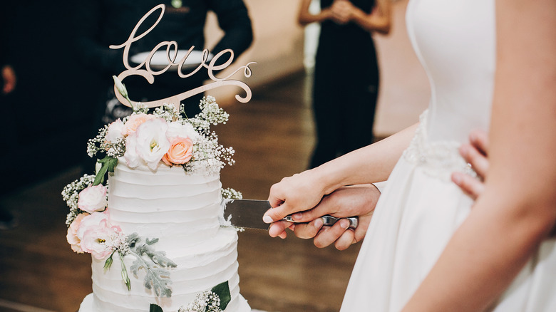 Nowadays, figurine wedding toppers have lost a significant amount of popularity, so they can be particularly hard to get your hands on unless you're shopping somewhere like Etsy. In fact, flowers and other botanical embellishments, the couple's initials, or a simple word like "love," are much more en vogue in modern times, but the meaning behind cake toppers for people who do elect to have them remains the same. Figurine cake toppers have evolved to further reflect a better representation of diversity and extended families, and now even include funny and comedic options for some light-hearted laughs on a monumental day.