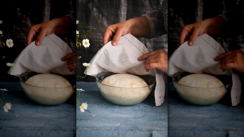 Plastic wrap and damp towels are both effective in protecting against debris and, more importantly, preventing a dry crust that would hinder the dough from successfully rising. Unlike single-use plastic, however, a moistened cloth is an eco-friendly solution that allows for some airflow, which can be helpful depending on temperature and altitude, since an airtight seal may occasionally impede yeast activity. Not to mention that a damp towel is a tried and true method — if it was good enough for grandma, it's good enough for you.