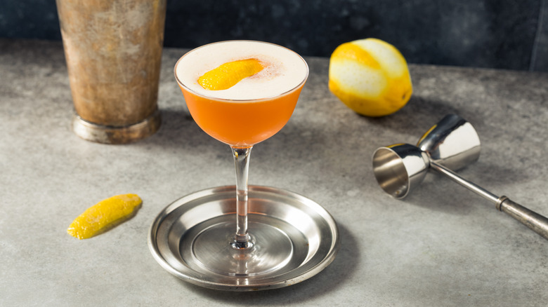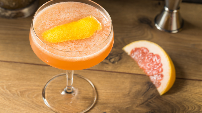 The Brown Derby cocktail is remarkable for its oddball ingredients — bourbon, grapefruit juice, and honey — a refreshingly bitter citrus profile that goes well with the sweet profile of bourbon. Bourbon's caramel and vanilla notes don't usually play well with citrus fruits, but grapefruit is an exception in this drink. As cocktails go, this one is easy to craft, with just three ingredients and no complicated syrups or liqueur additions to run up the shopping bill. We think there is nothing more glamorous than shaking an icy cocktail and straining it into an elegant cocktail coupe, creating a drink worthy of a star-studded glam event, even if you aren't among the stars of Hollywood.