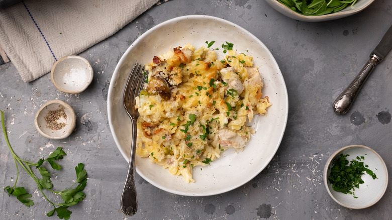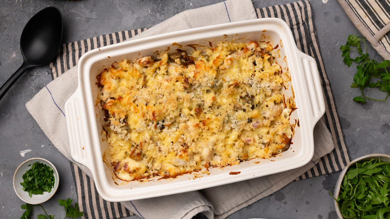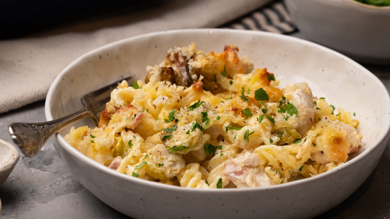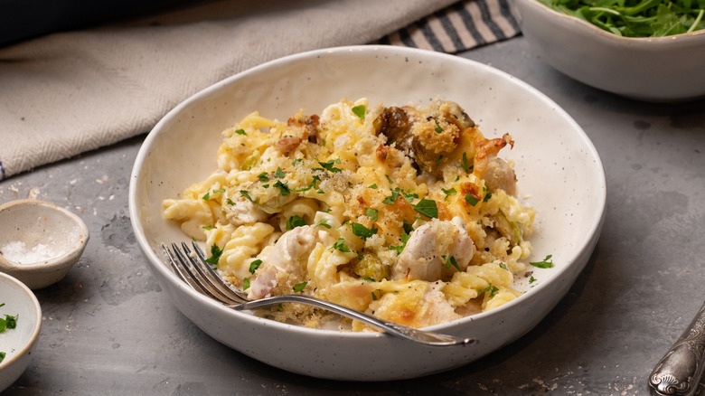 From the kitchen of Tasting Table recipe developer Jennine Rye, this dish features deliciously caramelized Brussels sprouts, chicken, and bacon in a wonderfully creamy white sauce enhanced with flavors of roasted garlic, Dijon mustard, and nutmeg. Mixed with pasta and then topped with grated cheddar cheese and fresh breadcrumbs, this pasta bake is cooked in the oven until the sauce is bubbling and the top is golden and crisp.