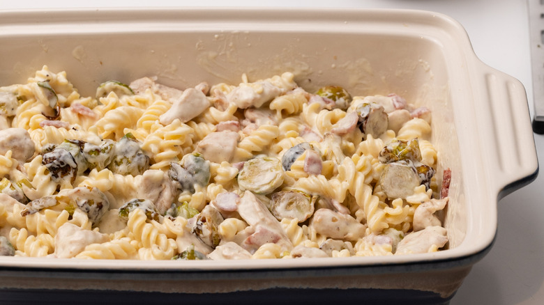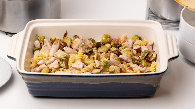 - In a large casserole dish, combine pasta, Brussels sprouts, and the chicken and bacon mixture.