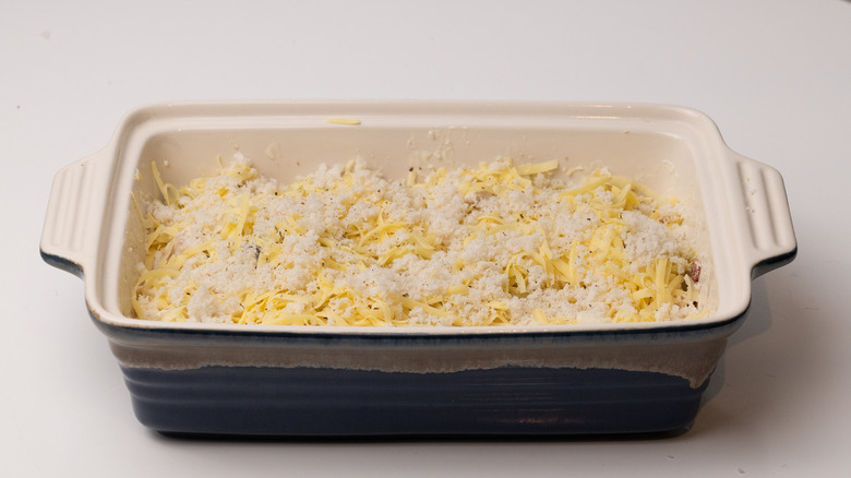 - Top with grated cheddar and fresh breadcrumbs.