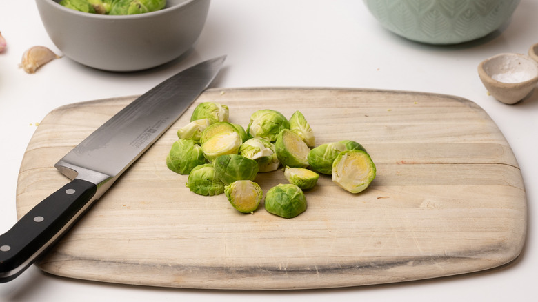 Prepare Brussels sprouts for roasting by removing any brown outer leaves and cutting the sprouts in half lengthwise.