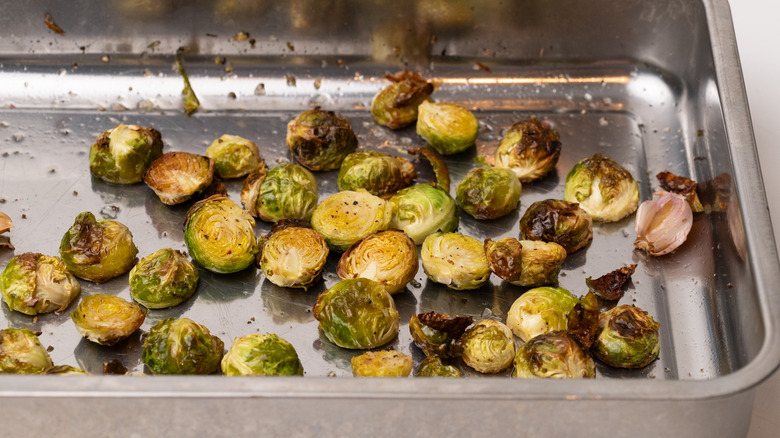 - Place Brussels sprouts in a roasting pan with 2 tablespoons olive oil, whole garlic cloves, and salt and pepper.