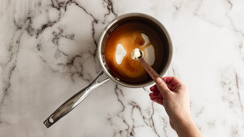 - In a large saucepan, combine the sugar, maple syrup, corn syrup, and butter.