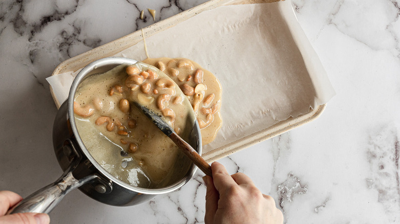 Our classic maple cashew brittle recipe calls for roasted, salted cashews for their subtle sweetness and crunchy texture, but you can certainly customize it by using different nuts. The possibilities are endless! For a nut with more pronounced flavor, try toasted pecans or walnuts. Pecans offer a buttery, rich taste that pairs wonderfully with the maple syrup and is extra luxurious when topped with melted chocolate. Walnuts have a slightly bitter note that balances the sweetness of the dish. For tropical flair, try macadamia nuts or pistachios. Their creaminess lends itself well to brittle. Almonds are another easy swap — go with slivered or sliced almonds for even cooking and texture. No matter what nut you choose, the method remains the same, so go ahead and start swapping to find your favorite variation. You really can't go wrong with sugar, butter, and nuts!