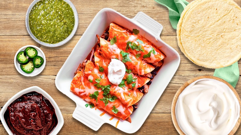 In mole, you might find sesame seeds, peanuts, pumpkin seeds, and almonds, along with herbs and spices such as coriander, cloves, cinnamon, pepper, thyme, marjoram, coriander, and allspice. Oh, also tomatoes, tomatillos, onion, garlic, chilies, plantains, and, of course, chocolate — the list goes on. Recipes can vary and be deeply personal based on family traditions, location, or available ingredients. Opt for making mole to mix things up rather than using a standard red or green enchilada sauce. Of course, if you're in a pinch, you can use ready-made mole or add a few ingredients to beef it up.