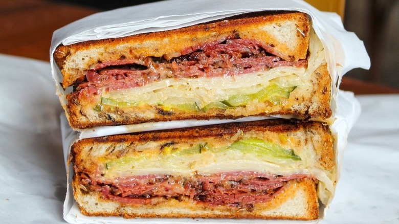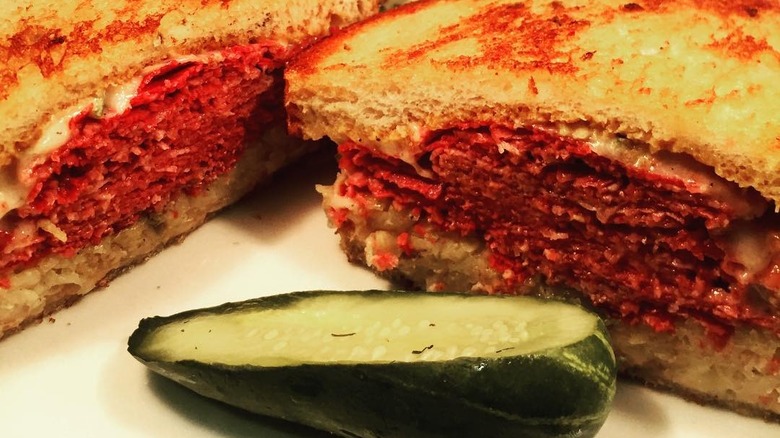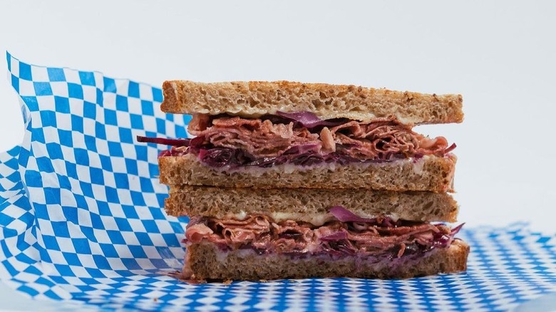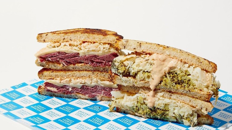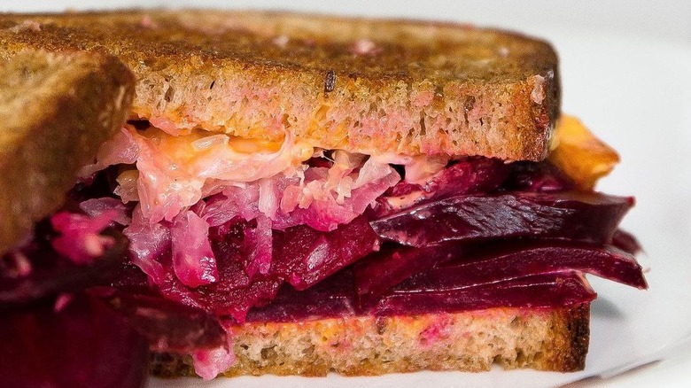 When you know how to make a good Reuben, which The Green Room Kukhnya in New Orleans does, it's only natural to want to branch out and try variations. This restaurant did exactly that, giving us the beet Reuben sandwich, a vegetarian version of the classic made with roasted beets, Swiss cheese, braised cabbage, Russian dressing, and buttered rye.
