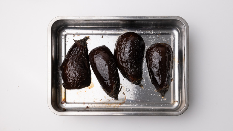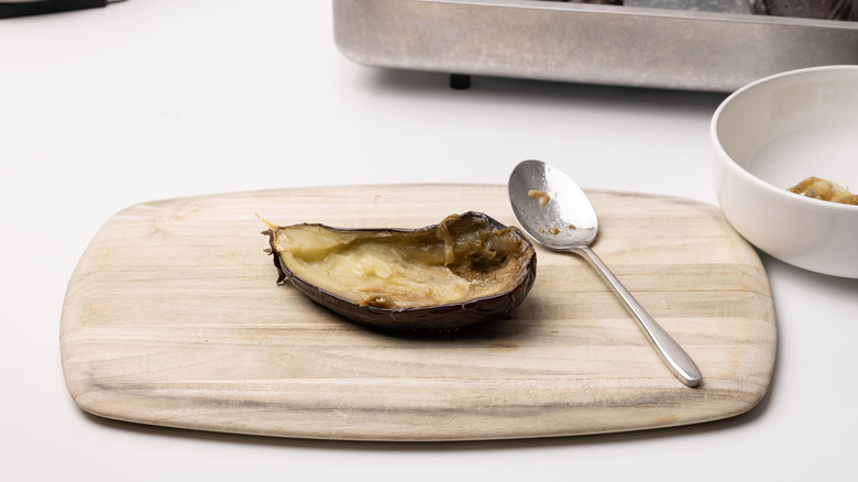- Once eggplants are cooked and soft, scoop out most of the flesh and roughly chop it.