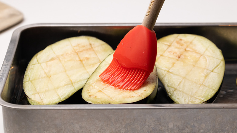 - Coat eggplant flesh with 2 tablespoons olive oil and place flesh side-down in a roasting dish.