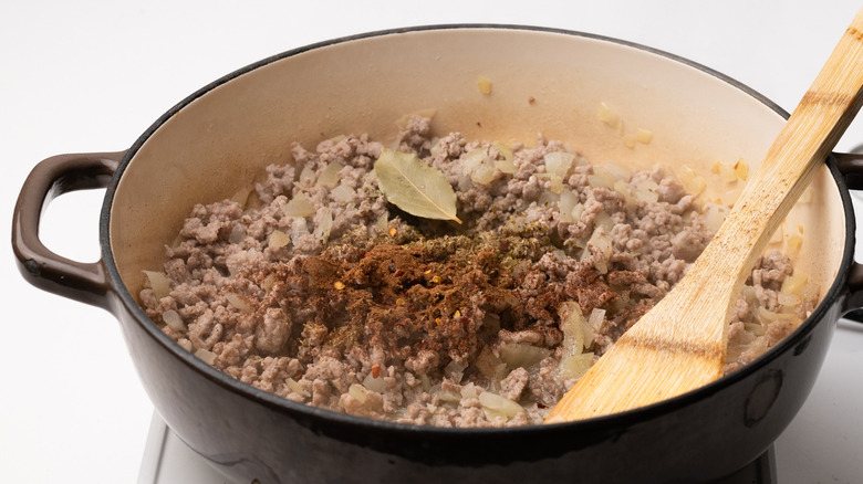 - Add oregano, cinnamon, chili flakes, bay leaf, and salt and pepper.