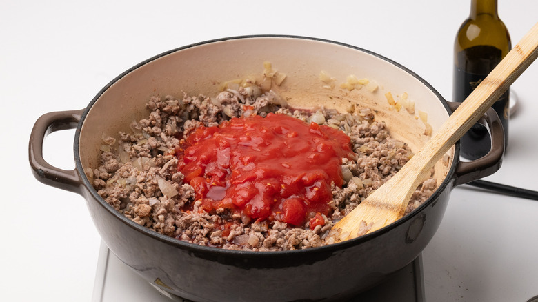 - Stir in the chopped tomatoes, red wine, and chicken stock.