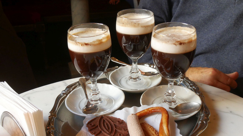 Those working to prepare bicerin must work strategically, making both coffee and chocolate at once so both drinks can be added to a glass and topped with layers of frothy milk. It can be helpful to employ some bartending techniques by using a spoon to pour hot chocolate into cups after adding the coffee to the glass. To preserve each distinct layer, using a spoon to float the hot chocolate can result in smoother, cleaner pours, and the denser chocolate mixture will drip to the bottom. At last, a frothy milky topping will make up one-third of the drink — a foamy crown on top of the cup of decadence if you will. Though the finished drink may look similar to an Irish coffee, this order is alcohol-free.