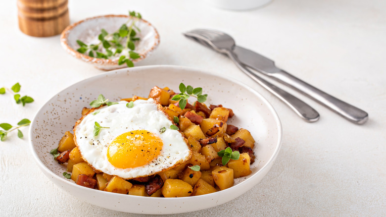 Potato hash is a dish that includes potatoes alongside other ingredients. At your local diner, you may find potato hash cooked in a skillet and served with flecks of bacon, peppers, onions, and topped with a fried egg. Now, this clearly differs from other potato dishes — breakfast or otherwise — because there's more than just potatoes in there. This makes potato hash more flexible than other potato dishes because you can incorporate whatever veggies, cheeses, or meats you have on hand.