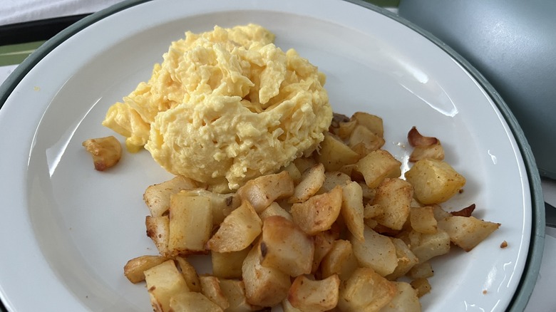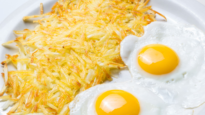 There's plenty of tips to cook hash browns perfectly — the type that stays crispy on the outside without soaking up too much oil like other potato styles. Plus, we love how the ratio of this potato preparation leans towards crusty rather than soft, with tiny bits of soft potato interspersed in each patty. This makes hash browns a phenomenal breakfast accompaniment to eggs and sausage — and worthy of kicking off the top 5.
