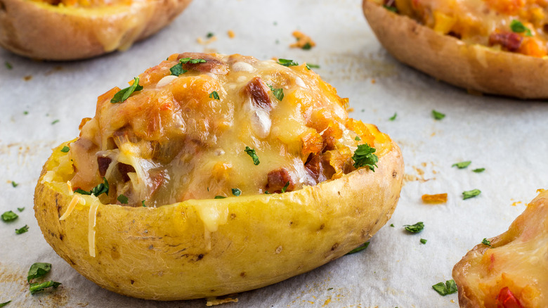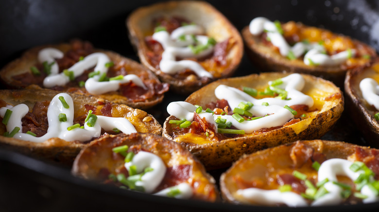 Loaded potato skins always seem to make their way to game day celebrations. This makes sense and is a great use of the potato skin's crunchy exterior. Load them up with bacon, cheese, and sour cream, and you've got the ultimate snack. They may be messy, but they're also a versatile vessel for whatever fillings you have hanging around in your kitchen.