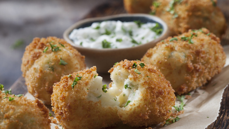 If you like mozzarella sticks and fritters, croquettes will likely be right up your alley. These fried balls are made with grated potatoes, stuffed with cheese and herbs, and covered in crispy breadcrumbs. Usually, this potato dish is made in the deep fryer (even a surprisingly light croquette recipe uses that cooking method). But you can easily cook them in an air fryer, too, to diminish the oiliness.